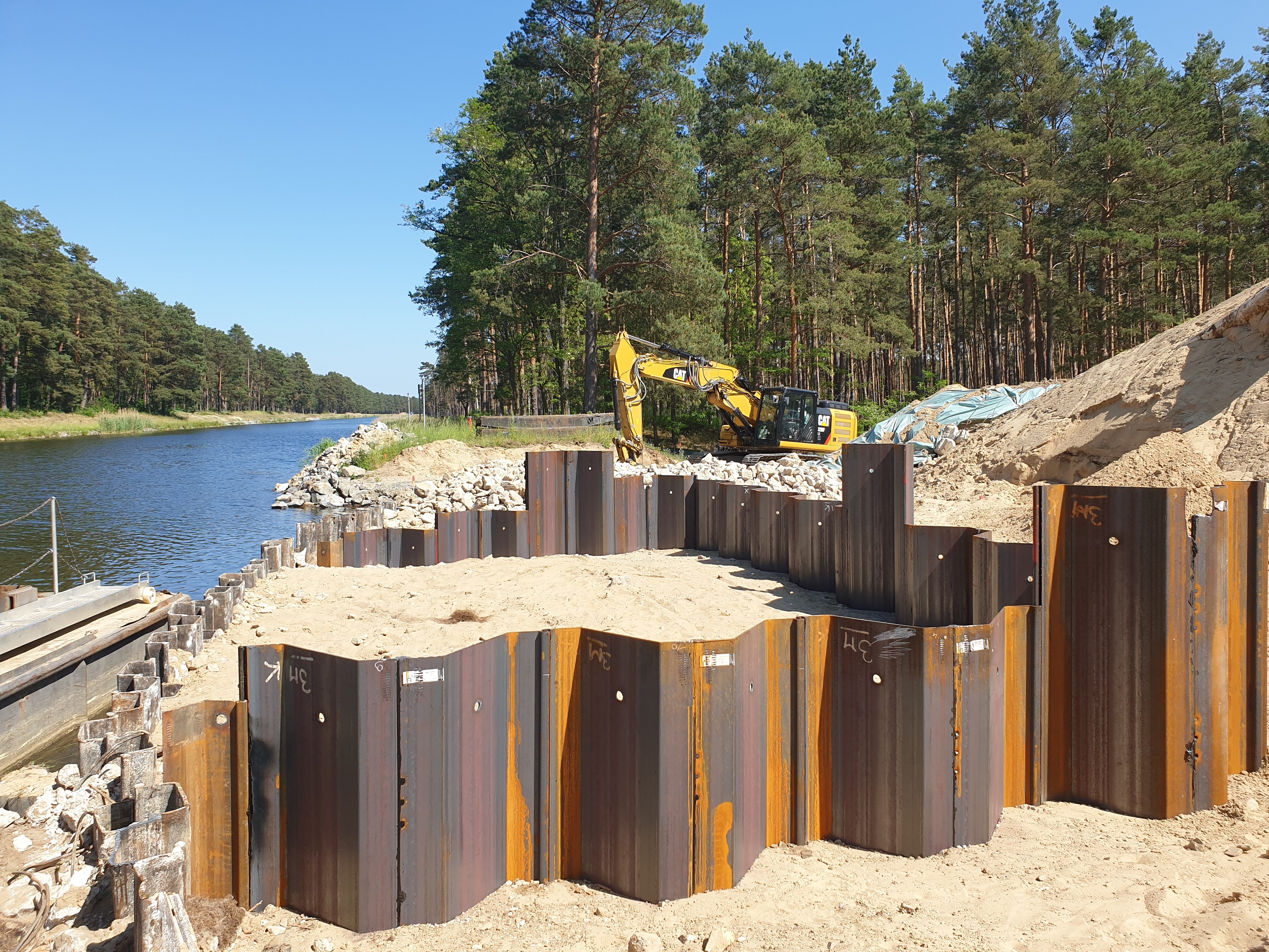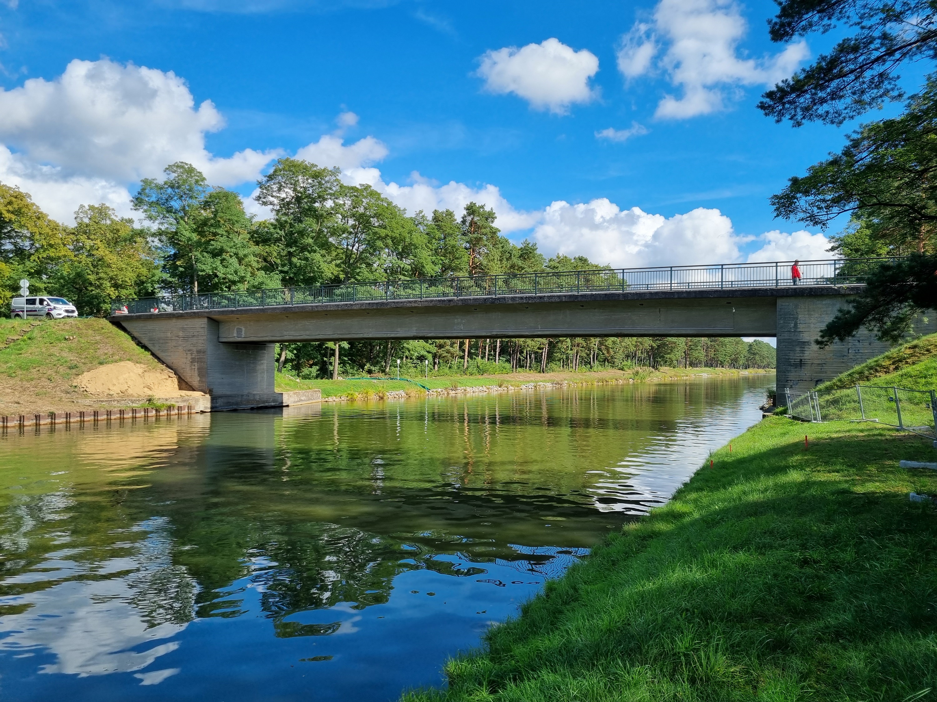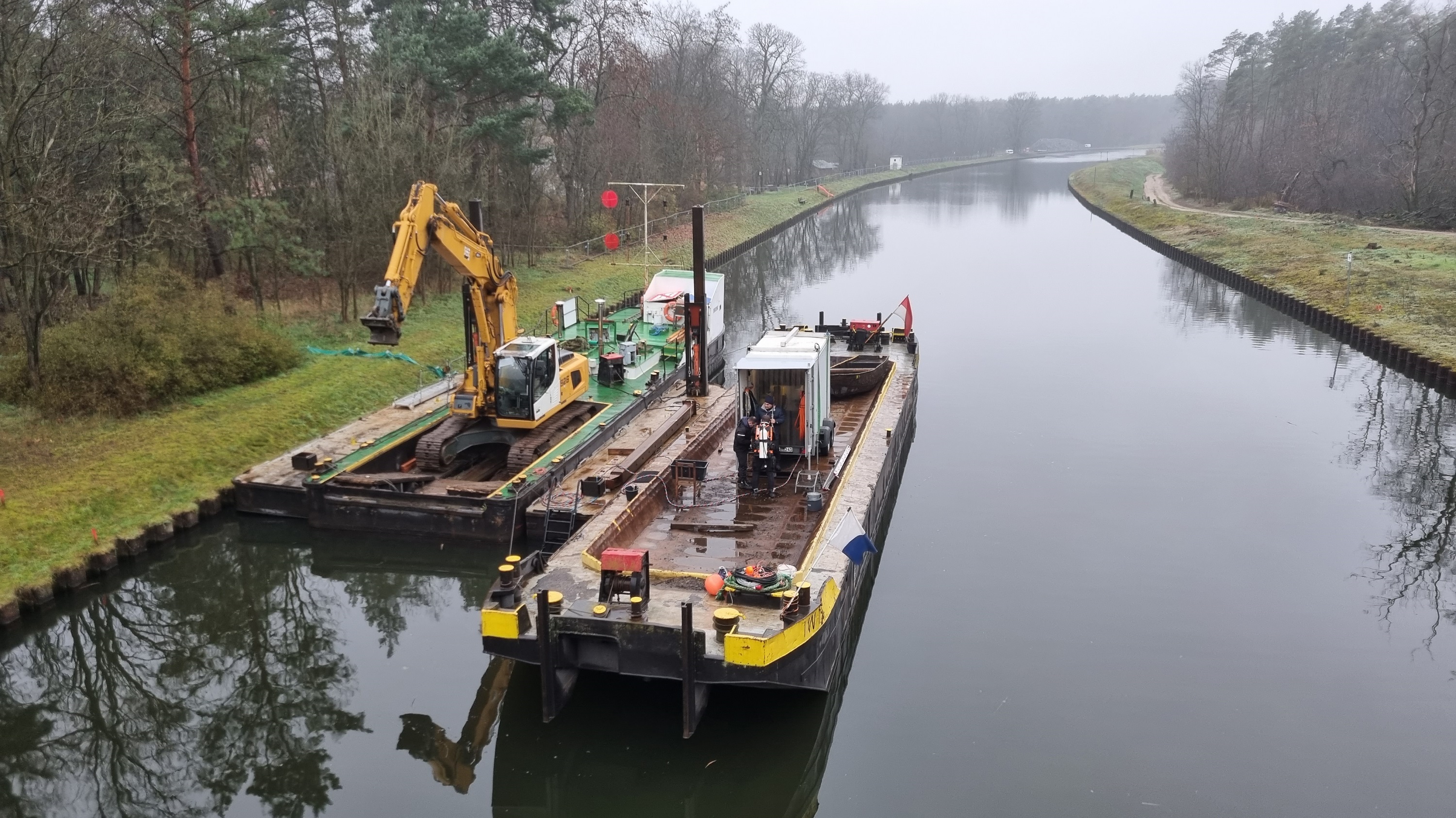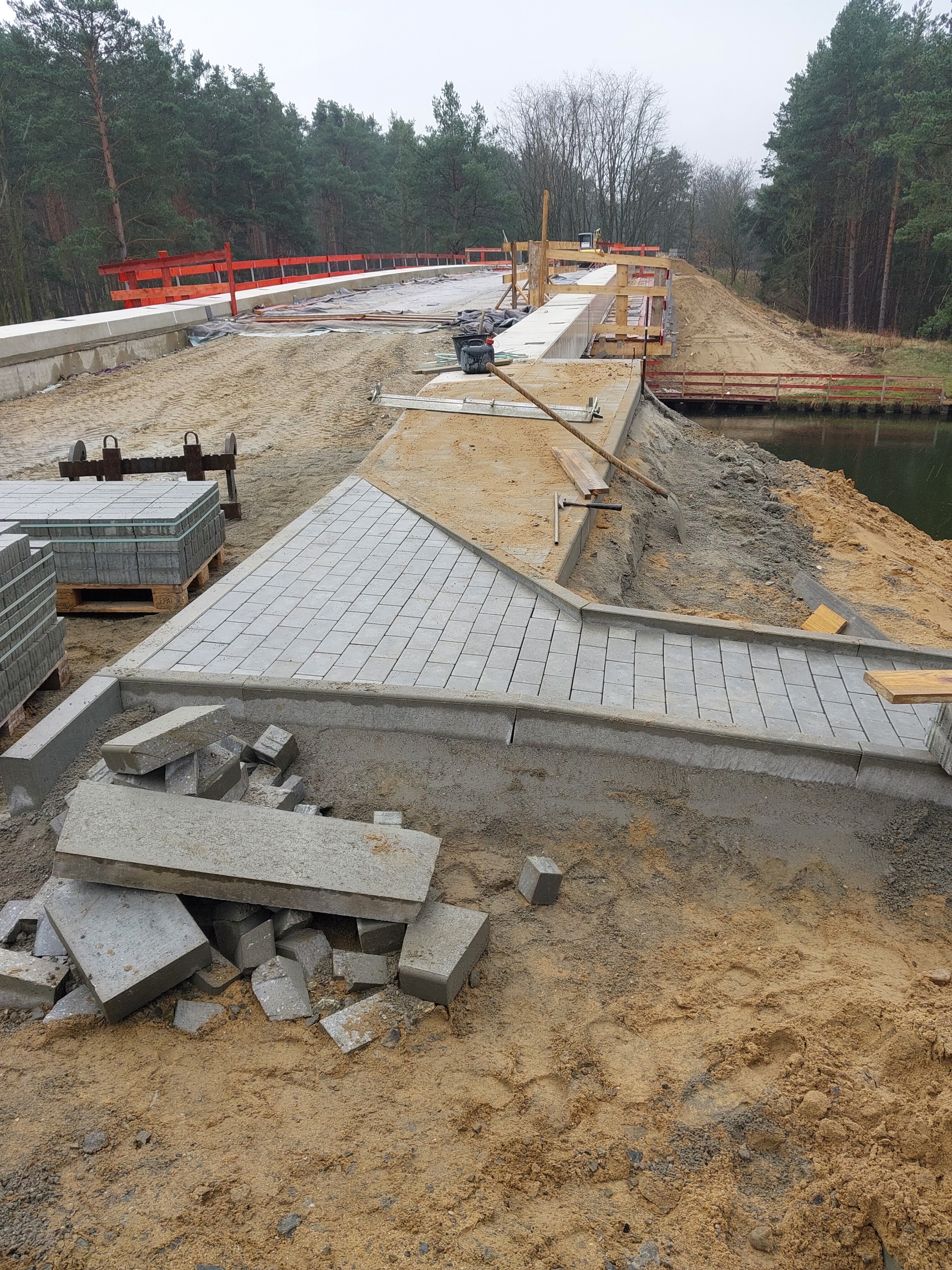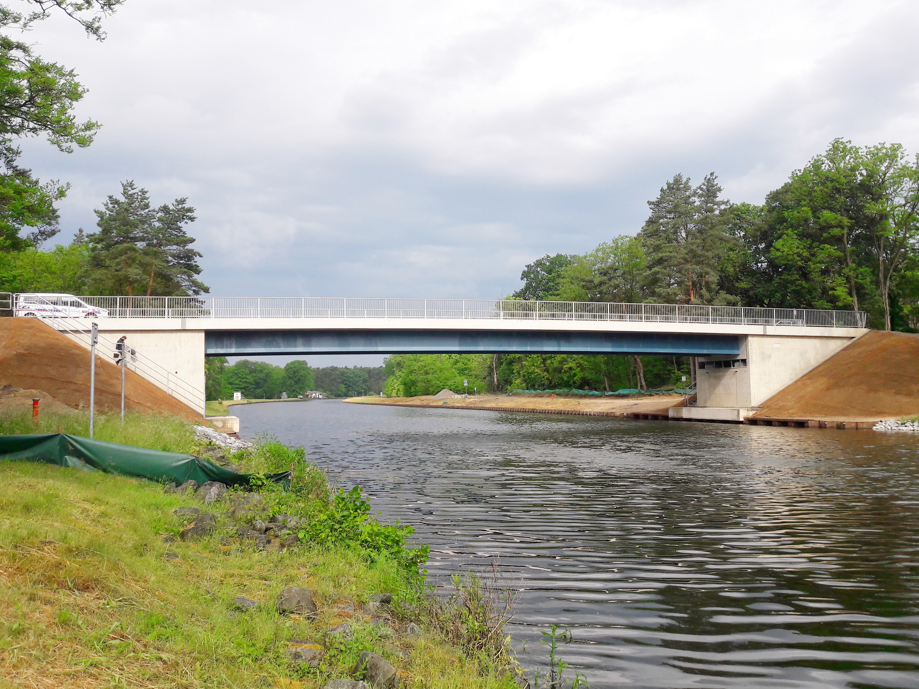 Der Auftrag des Wasserstraßen-Neubauamts Berlin für das 4,1 Millionen teure Bauvorhaben ging eine ARGE, an der unsere Tochtergesellschaft VIA Structure mit 90 Prozent beteiligt war und die hier die Funktion als Generalauftragnehmerin übernahm. Ende 2022 fanden die ersten Bauvorbereiten statt, für April 2023 der Abriss vorgesehen. Der ursprüngliche Plan hatte vorgesehen, dass die Brücke als Ganzes ausgehoben und am Nordufer des Kanals stückweise zerkleinert werden. Aus statischen Gründen konnte die Brücke nicht, wie ursprünglich vorgesehen,dies jedoch nicht umgesetzt werden als Ganzes ausgehoben und am Nordufer des Kanals stückweise zerkleinert werden. Die Brücke wurde deshalb von einem vorübergehend eingebauten Querdamm zwischen dem 3. bis 28. April 2023 zurückgebaut. Der Schiffverkehr war in der Zeit gesperrt.