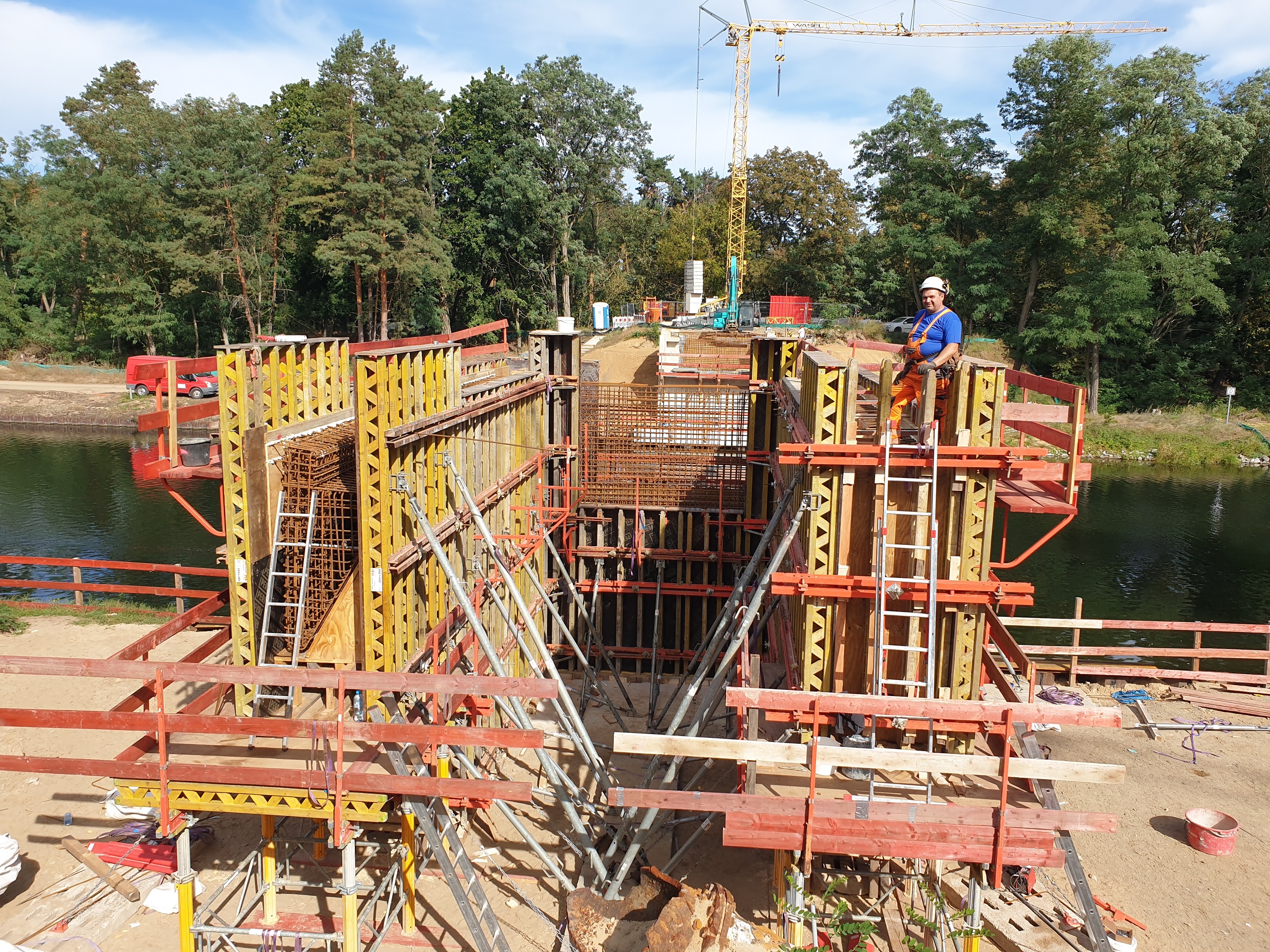 Anschließend hat die VIA Structure GmbH Spundwände und Spundkäste errichtet, die Fundamente hergestellt, das Widerlager gebaut und im Oktober 2023 den die 36 Tonnen schweren Stahlträger mit einem 500-Tonnen-Kran eingehoben. , derDiese wurden von dem ARGE-Partner SAM Stahlturm- & Apparatebau Magdeburg produziert wurde. Vor allem Letzteres war ein besonderes Ereignis, da hier 36 Meter lange und 36 Tonnen schwer Stahlträger von einem 500-Tonnen-Kran eingehoben wurden.