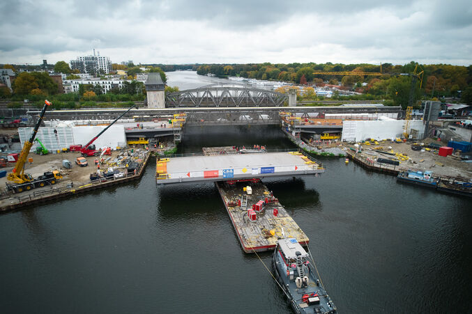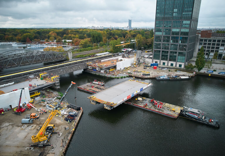 Seit 7 Uhr war die Teams der ARGE vor Ort, um das Brückenteil mithilfe eines sogenannten Schubboots exakt in Position zu bringen. Vier Litzenheber, die an den bereits errichteten landseitigen Brückenteilen befestigt waren, haben das Brückenbauteil dann in die endgültige Lage eingehoben. Dort wird es in den kommenden Tagen mit den angrenzenden Brückenteilen verschweißt. Während der Arbeiten war der Schiffsverkehr auf der Spree vollständig gesperrt.