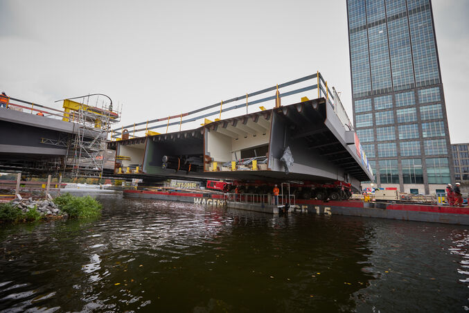Ein 400 Tonnen schweres Mittelteil einer Brücke sieht man wohl selten auf der Spree. Doch am 15. Oktober 2025 war genau das der Fall: Nach der Herstellung der Widerlager und der Pfeiler der neuen Elsenbrücke sowie monatelangen Vorbereitungen hatte die ARGE unter der technischen Federführung der Via Structure, eine Schwesterfirma von EUROVIA, das Mittelteil des Brückenüberbaus über die Spree zur Einbauposition transportiert. Dieses war zuvor in 15 Einzelteilen zur Baustelle geliefert, auf der Vormontagefläche ausgerichtete, untereinander verschweißt und anschließend auf ein Ponton verladen worden.