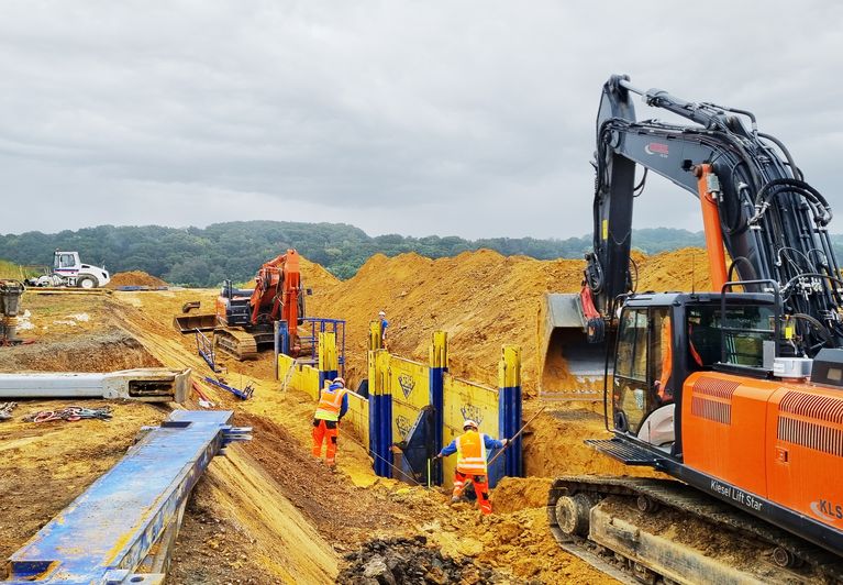 In einem zweiten Bauabschnitt fanden dann weitere Erd-, Tief-, Kanal-, Pflaster- und Asphaltstraßenarbeiten statt, um die Ver- und Entsorgung sowie die Zufahrt zum Baufeld des künftigen Wohngebiets zu erschließen. Bis September 2022 wurden alle Kanäle verlegt, Straßen gebaut und ein Kreisverkehr errichtet. Mitte 2023 sollen dann laut Planung der Stadt Wetzlar baureife Grundstücke zur Verfügung stehen. Zum Einsatz kamen bei dem Gesamtprojekt unter anderem zwei Kettenbagger mit einem Einzelgeweicht á 40 Tonnen, um die schweren Anbauteile wie etwa Rohrzonenverdichter zu verladen.