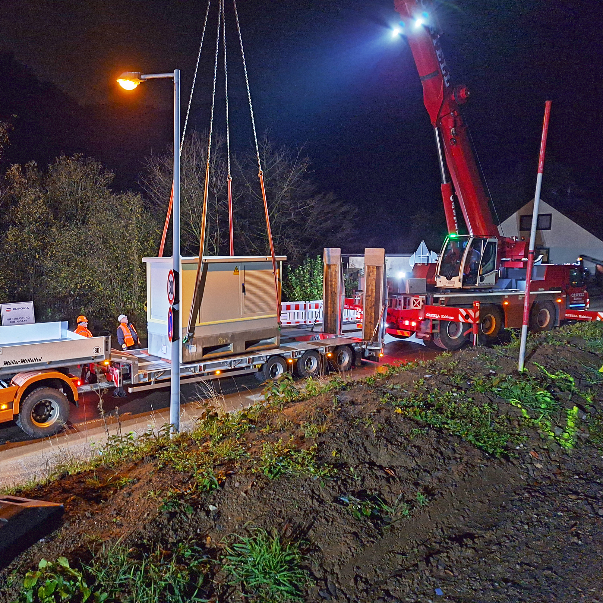 Parallel dazu hat die Zweigstelle Koblenz eine Umfahrungsstraße errichtet. Hintergrund: Im Laufe des Jahres 2025 wird eine westliche Teilstrecke komplett gesperrt werden. Damit die Anwohnerinnen und Anwohner zu ihren Häusern gelangen, war die Umfahrungsstraße notwendig. Zudem soll der Bereich als Zwischenlager genutzt werden. Für die Umfahrungsstraße musste ein spezieller Kran anrücken, um das tonnenschwere Einlaufbauwerk für den Entwässerungsgraben der Umfahrungsstraße einzuheben. Der Verkehr wurde dafür komplett gesperrt, der Einhub geschah in der Nacht vom 16. auf den 17. November 2023.