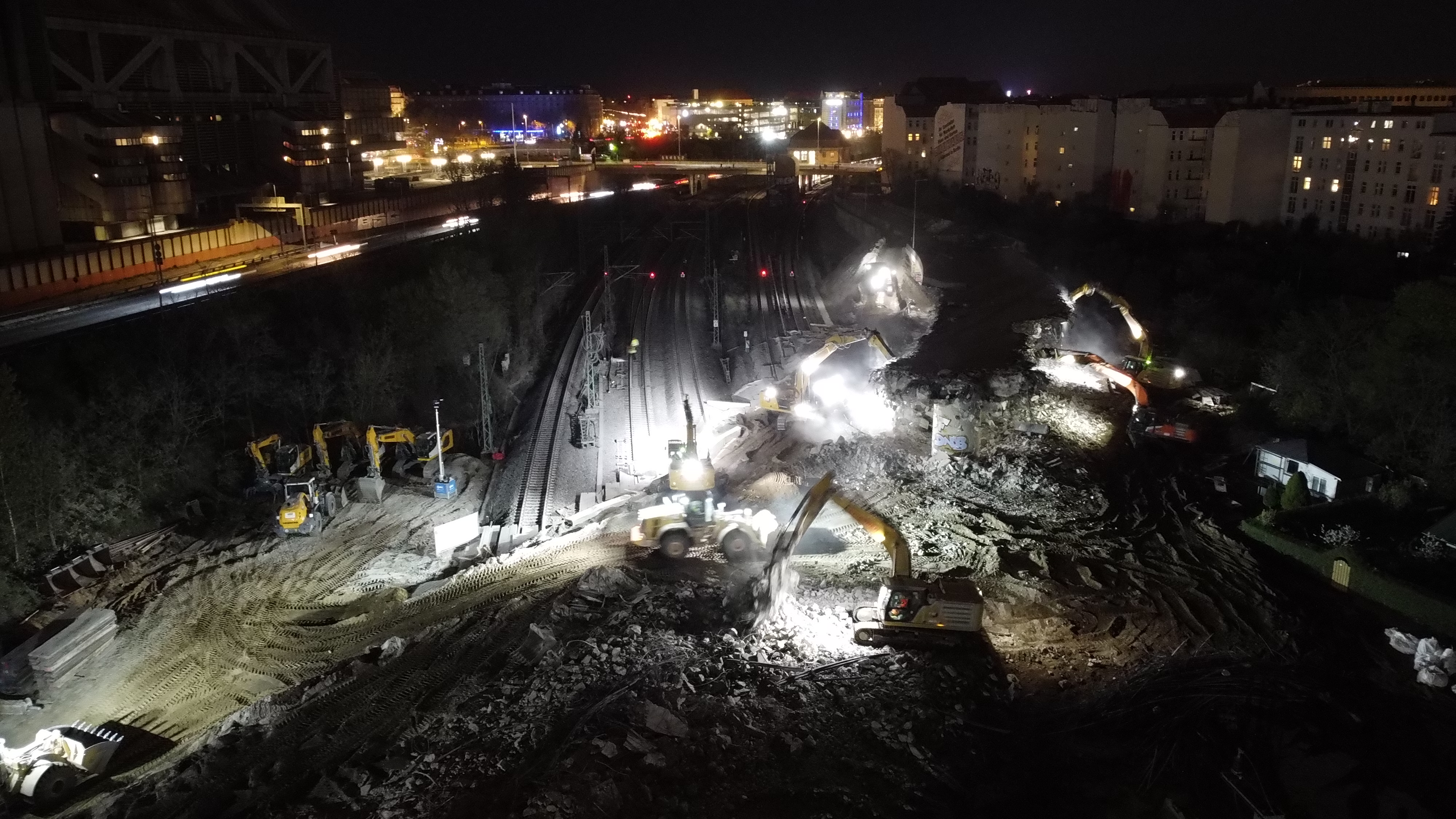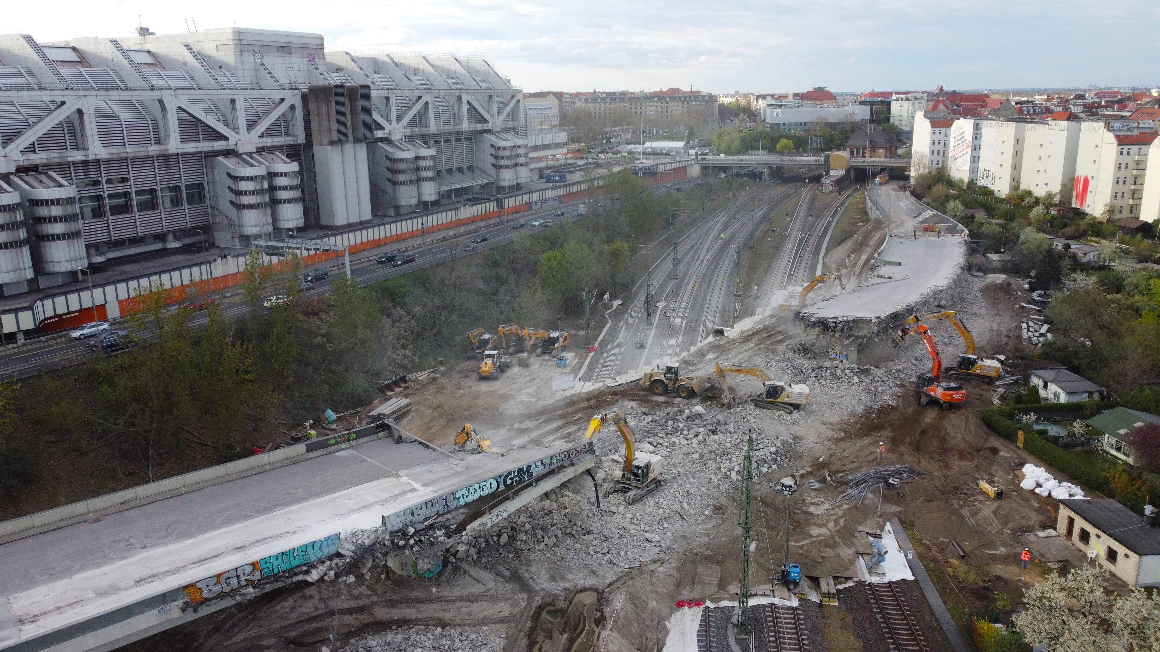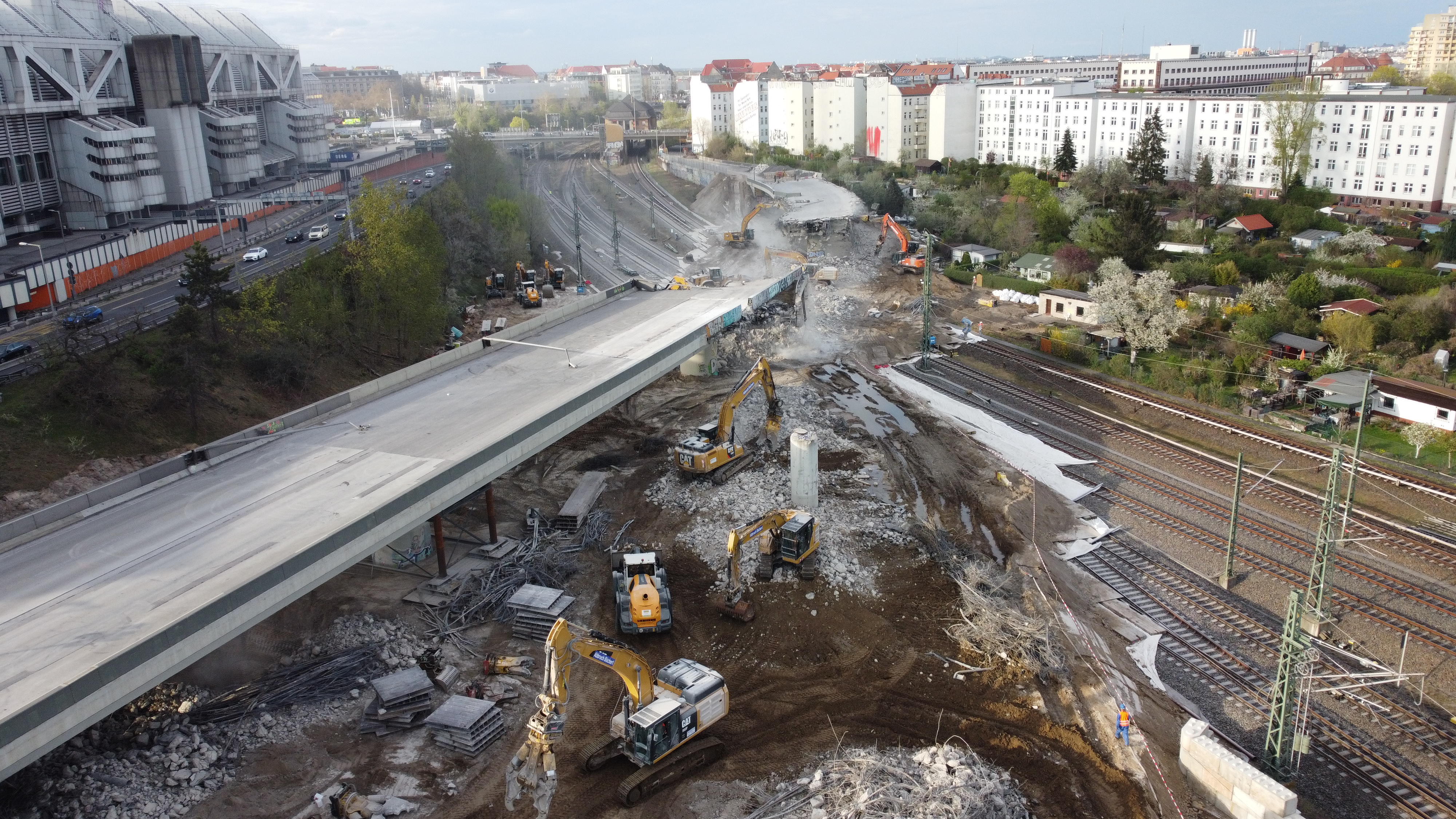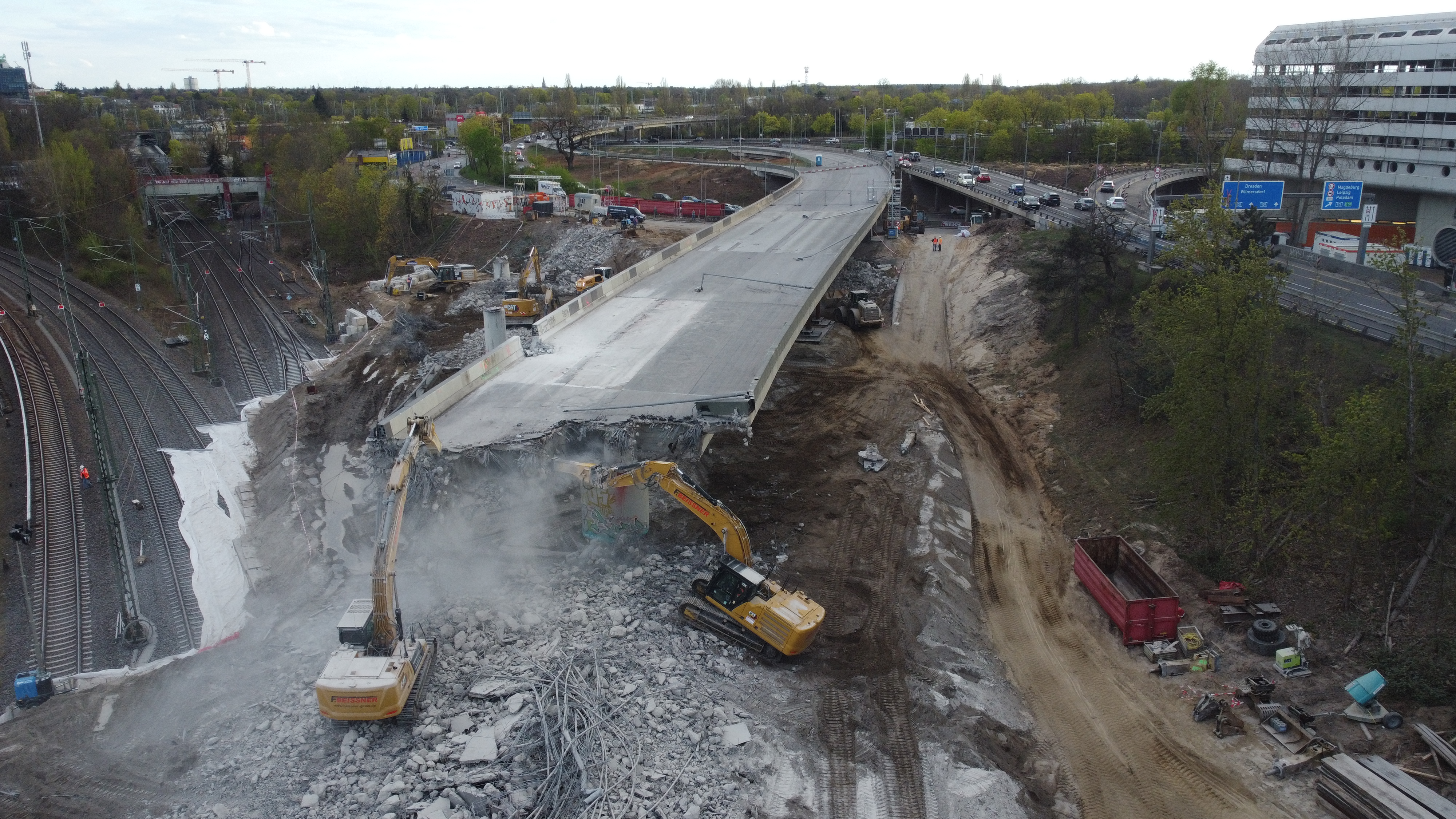 Vom 28. März bis zum 17. April haben EUROVIA und Via Structure am Abbruch der Ringbahnbrücke an der A100 in Berlin gearbeitet. Via Structure hat die Abbrucharbeiten inkl. Planung und Koordination übernommen, während EUROVIA die bauvorbereitenden Maßnahmen durchgeführt hat wie das Einrichten von Mittelstreifenüberfahrten und der Baustraßen.