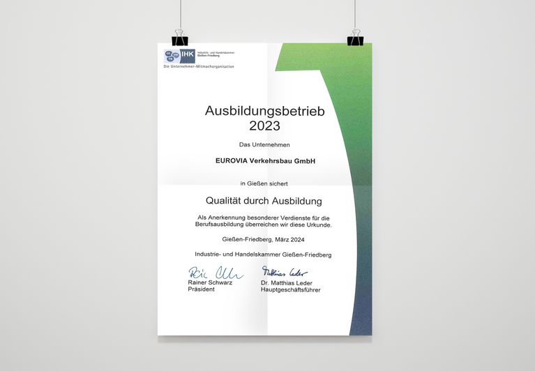 Nachwuchskräfte auszubilden und sie für die Berufslaufbahn im Straßenbau zu qualifizieren, ist ein wichtiges Anliegen der EUROVIA Zweigstelle Gießen. 2022 erhielt die Zweigstelle erstmalig das Zertifikat „Qualität durch Ausbildung“ der Industrie- und Handelskammer Gießen-Friedberg. Dieses wird als „Anerkennung besonderer Verdienste durch die Berufsausbildung“ verliehen. Auch in diesem Jahr erhielt die EUROVIA Zweigstelle Gießen das Siegel und bestätigt damit die Qualitätsansprüche als Ausbildungsbetrieb. Dazu gehört auch, im Rahmen von Schulungsprogrammen Fachkräften zu Werkspolieren / geprüften Polieren weiterzuentwickeln.